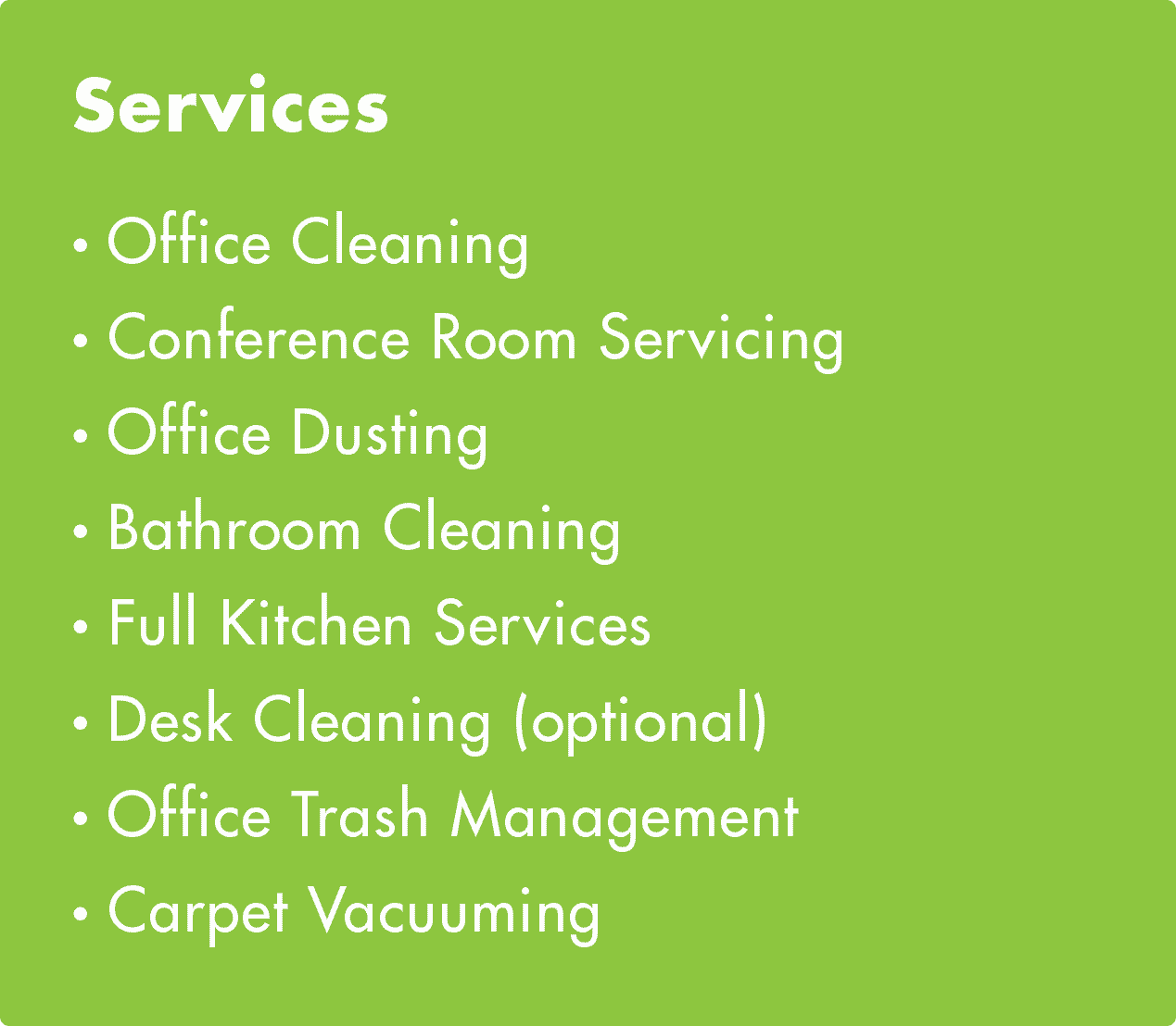 2 We Clean Tidy your Space Professional Cleaning Services with all natural cleaning products on the date. Our Jersey City building maintenance includes general cleaning such as emptying trash sanitizing restroom fixtures dusting furniture interior window cleaning if requested. We offer quotations for your house or corporation within Two hours in.